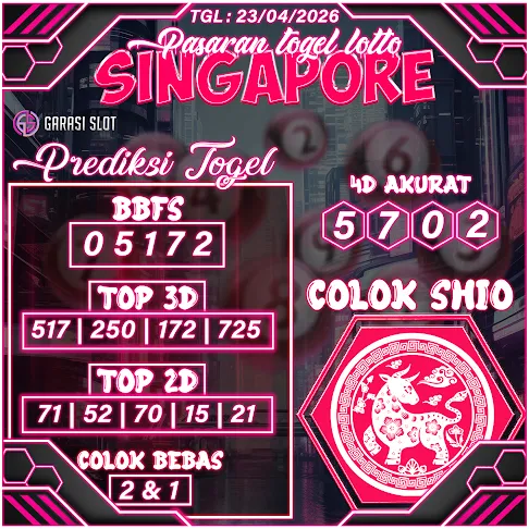 Togel SINGAPORE adalah pasaran terlaris yang hampir tidak pernah tergantikan. Setiap harinya ribuan pengguna memburu dan mencari prediksi jitu seputaran togel SINGAPORE hari ini. Nah, dibawah ini adalah prediksi togel SINGAPORE Lotto 23 APRIL 2026 terbaik.