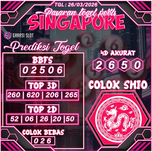 Togel SINGAPORE adalah pasaran terlaris yang hampir tidak pernah tergantikan. Setiap harinya ribuan pengguna memburu dan mencari prediksi jitu seputaran togel SINGAPORE hari ini. Nah, dibawah ini adalah prediksi togel SINGAPORE Lotto 26 APRIL 2026 terbaik.