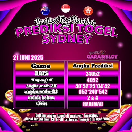 Prediksi togel Sydney hari ini yang ditawarkan GARASISLOT akan membantu Kamu dalam menyelesaikan catatan menyiapkan angka main. Prediksi GARASISLOT adalah halaman khusus untuk membocorkan angka prediksi seputaran pasaran togel terbesar di Indonesia. Hasil prediksi yang dirilis oleh tim khusus situs togel terpercaya GARASISLOT ini mempunyai tingkat akurat terbaik.