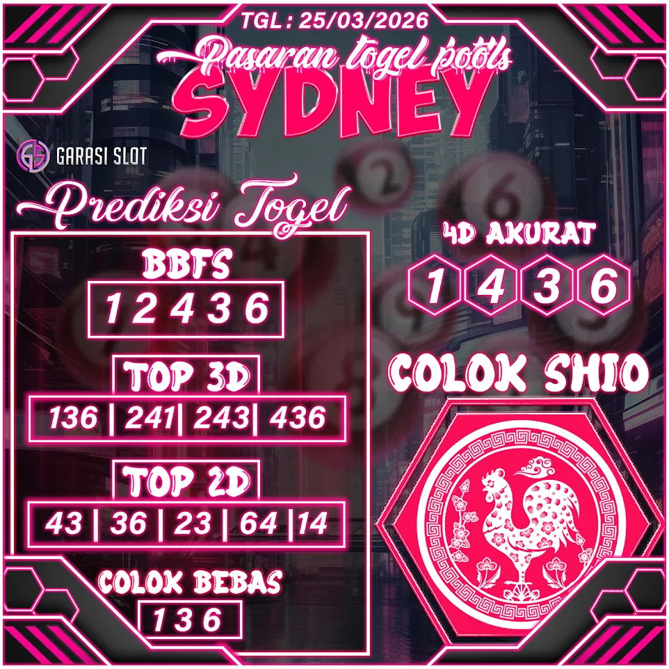 Togel SYDNEY adalah pasaran terlaris yang hampir tidak pernah tergantikan. Setiap harinya ribuan pengguna memburu dan mencari prediksi jitu seputaran togel Sydney hari ini. Nah, dibawah ini adalah prediksi togel Sydney Lotto 25 APRIL 2026 terbaik.