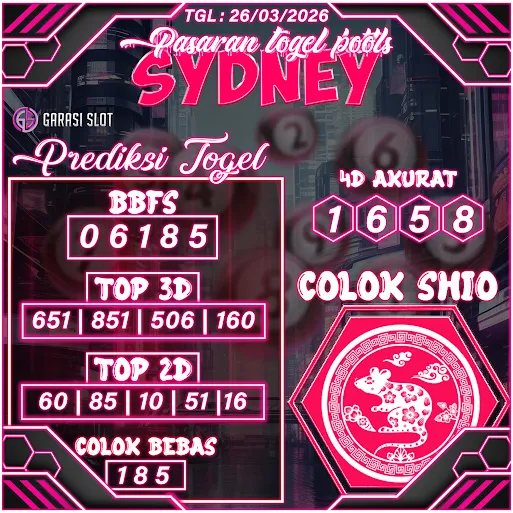 Togel SYDNEY adalah pasaran terlaris yang hampir tidak pernah tergantikan. Setiap harinya ribuan pengguna memburu dan mencari prediksi jitu seputaran togel Sydney hari ini. Nah, dibawah ini adalah prediksi togel Sydney Lotto 26 APRIL 2026 terbaik.